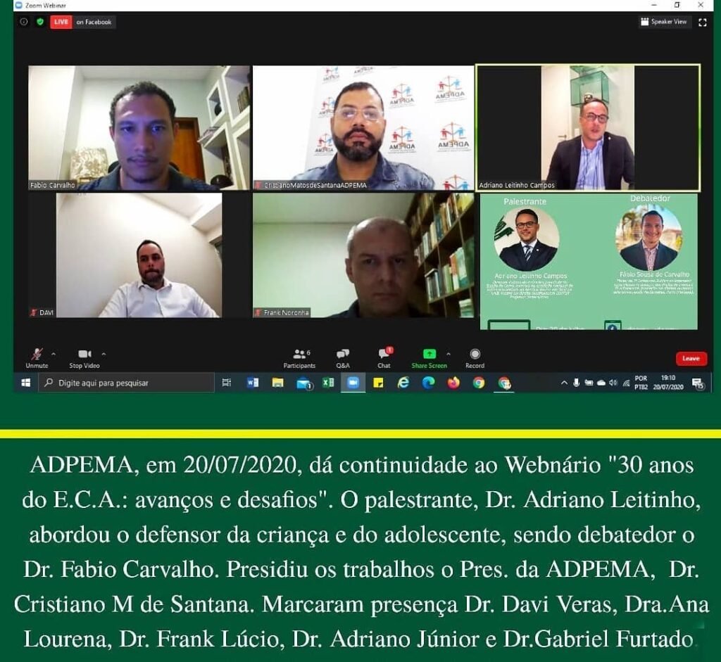 ADPEMA, através do Pres. Cristiano Matos de Santana, em 14/07/2020, abriu os trabalhos do Webinário “30 anos do E.C.A: avanços e desafios”. Foi palestrante o Dr. Daniel Palotti, debatedora a Dra. Ana Lourena M. Costa e houve participação do Dr. Fábio Carvalho e do Dr. Frank Lúcio.